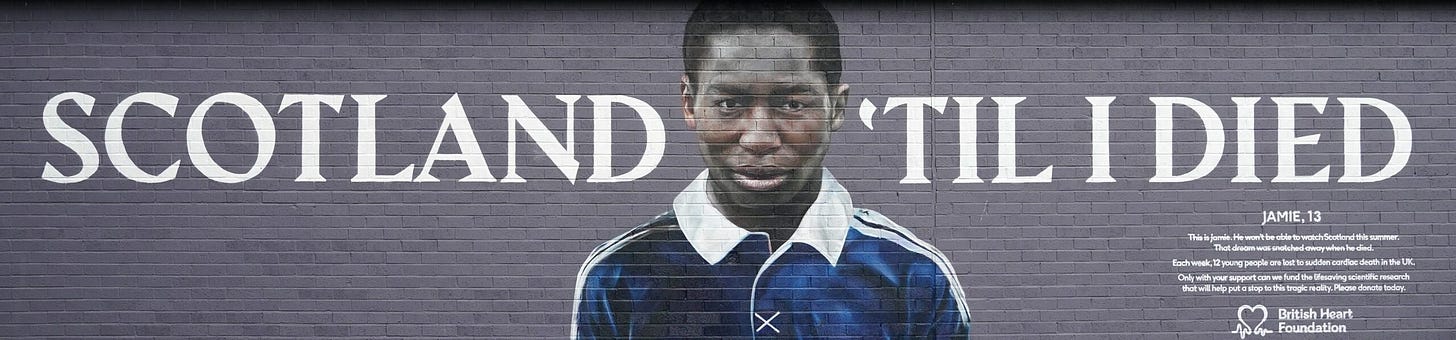 To draw attention to heart problems in young people, the British Heart Foundation added a letter to the famous "England/Scotland 'til I die" and changed it to England/Scotland 'til I died.